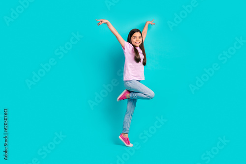 Fototapeta premium Full size photo of funny small girl hands up wings balance careless chill...