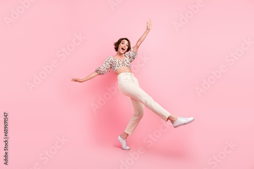 © deagreez, Fototapeta premium Full size photo of good mood girl dressed stylish blouse white trousers stand on tiptoe hold balance isolated on pink color background