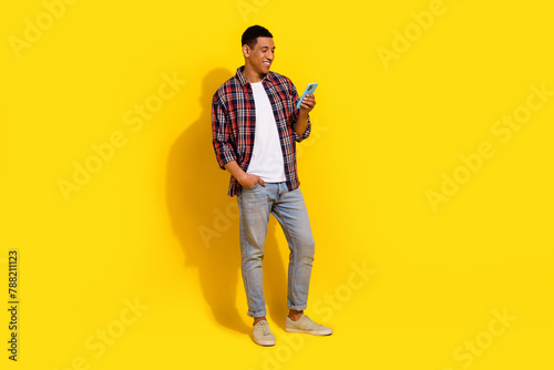 © deagreez, Fototapeta premium Full size photo of good mood man dressed plaid shirt jeans trousers look at smartphone read email isolated on yellow color background