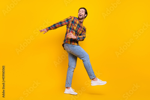 Fototapeta premium Full size photo of joyful brunet millennial guy dance wear shirt jeans sneakers isolated on yellow background