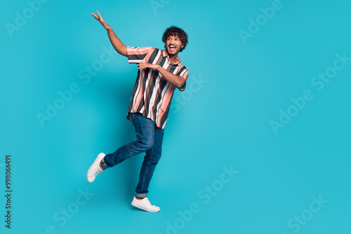 Fototapeta premium Full size photo of nice young man dancing wear shirt isolated on teal color...