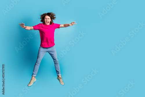 © deagreez, Fototapeta premium Full size photo of nice young man jump fall empty space wear t-shirt isolated on blue color background
