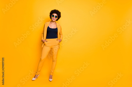 Fototapeta premium Full size photo of positive cheerful elegant afro american girl have fun rest relax feel dream dreamy wear stylish fashionable outfit isolated over yellow color background