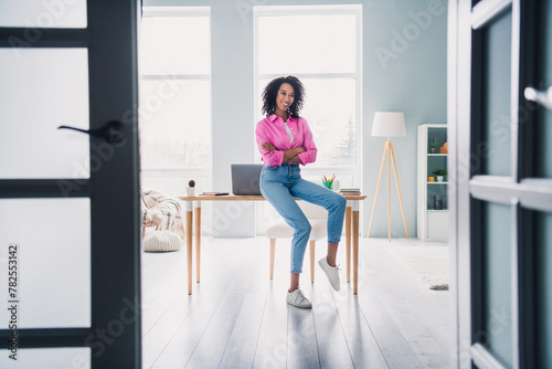 Fototapeta premium Full size photo of pretty young girl sit table confident entrepreneur wear...