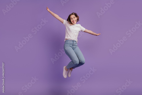 Fototapeta premium Full size photo of young cheerful girl jump up hands wings casual outfit isolated on violet color background