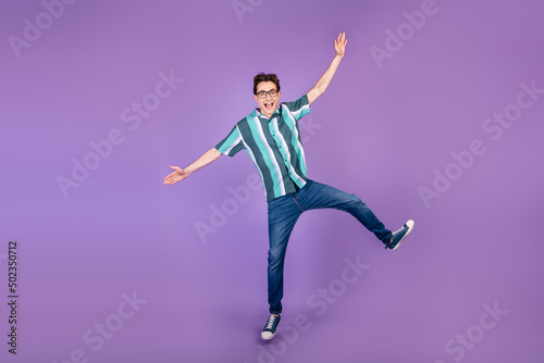 Fototapeta premium Full size photo of young man jump up fooling playful have fun wear casual clothes isolated over violet color background