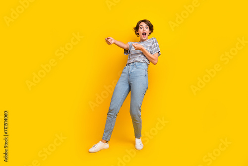 © deagreez, Fototapeta premium Full size portrait of astonished girl arms pull empty space rope string isolated on yellow color background