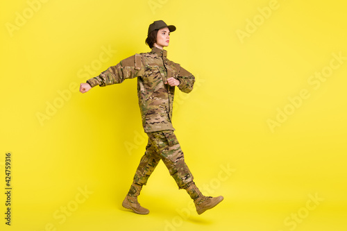 Fototapeta premium Full size profile photo of calm focused girl look empty space marching...