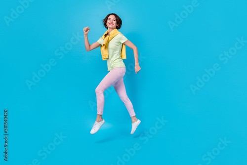 © deagreez, Obraz premium Full size profile photo of cool young brunette lady run wear t-shirt trousers shoes isolated on blue background