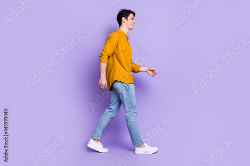 Fototapeta premium Full size profile photo of friendly brunet young guy go wear shirt jeans...