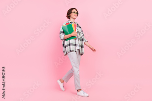 Fototapeta premium Full size profile side photo of young woman happy positive smile go walk notebook study isolated over pink color background