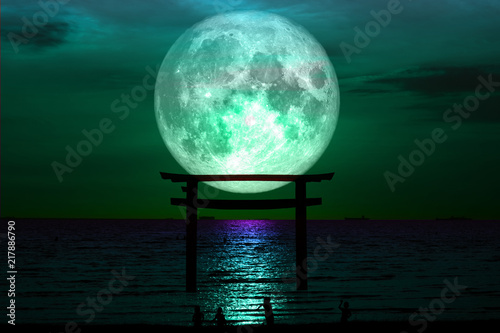 Naklejka premium full sturgeon moon silhouette torii wooden Japanese pillar stand on sea night sky