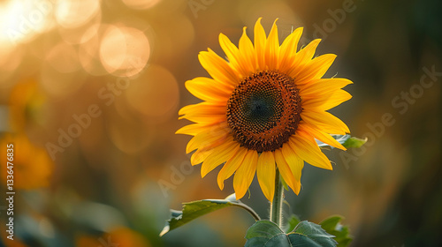 Fototapeta premium Full version of a wild sunflower (Helianthus annuus), bright golden petals...