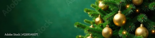 Fototapeta premium Full, vibrant green Christmas tree adorned with rich gold decorations , festive, Christmas tree lights, winter background