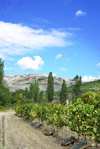 © i_tkach, Obraz premium Full wooden boxes with grape bunches