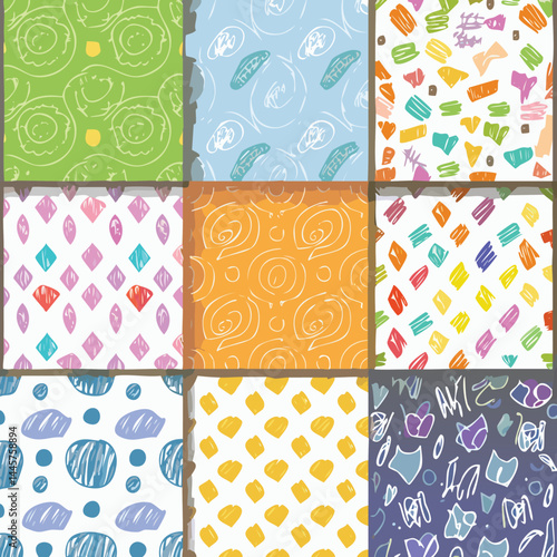 Fototapeta premium Fun and Whimsical Children’s Crayon Doodle Patterns – Seamless Background Set