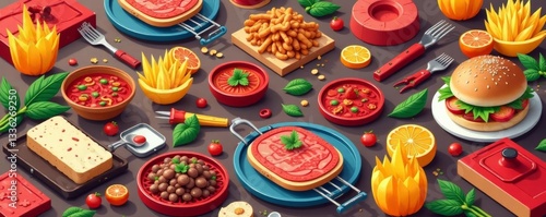 © Bamphen, Fototapeta premium Fun cartoon illustrations of BBQ items in repeat design, outdoors, meats, design