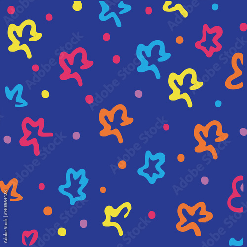 © Suriea, Obraz premium Fun colorful line doodle seamless pattern. Creative minimalist style art background for children or trendy design with basic shapes. Simple party confetti texture, childish scribble shape backdrop.
