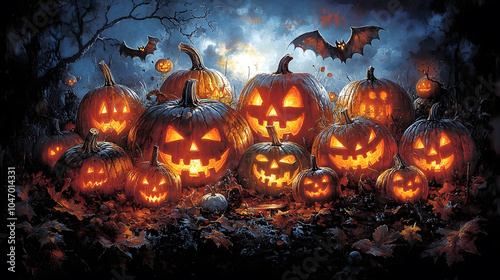 Fototapeta premium Fun Halloween art print showing a pumpkin patch filled with various jack-o'-lanterns
