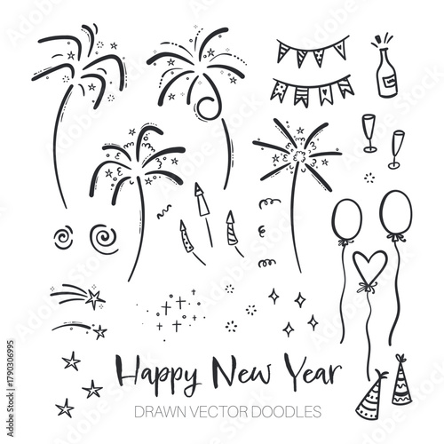 Obraz premium Fun hand drawn New Years Party doodles - firework, paper streamers,...