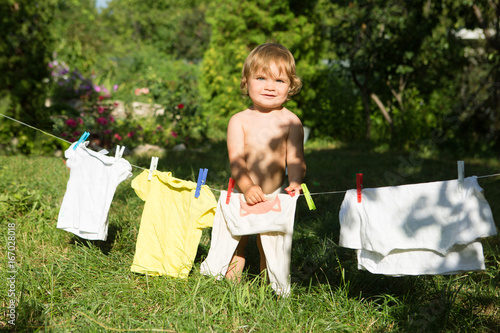 Fototapeta premium fun happy baby girl to wash clothes and laughs in the meadow on a sunny summer day.