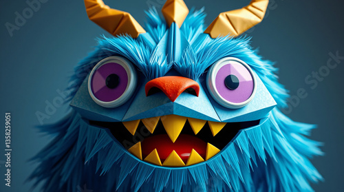 Fototapeta premium Fun, playful, blue, monster, cartoon, smiling, big eyes, horns, furry, friendly, whimsical, colorful, cheerful, animated, character, creature, imaginative, vibrant, happy, fantasy, mythical, illustrat