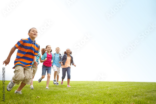 © peopleimages.com, Obraz premium Fun, running and group of kids on grass for outdoor games, race and happy development space. Diversity, energy and children playing in field together with smile, growth and summer mockup on low angle