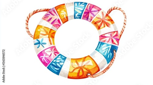 Obraz premium Fun summer accessory illustration featuring a lifebuoy with colorful patterns, lightly textured and isolated on white