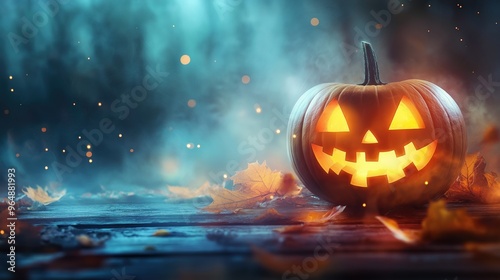 © Dudarte, Fototapeta premium Fundo fotográfico de Halloween com abóboras iluminadas em piso de madeiras rústico e luzes desfocadas ao fundo. Ideal para convites, banners e outros projetos de Halloween