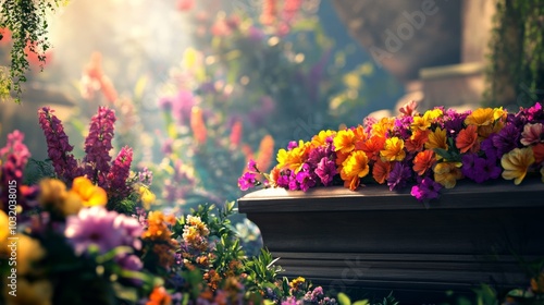 Obraz premium Funeral Coffin with Floral Decorations in Church with Soft Light Gentle Shadows