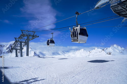 © Natalia, Obraz premium Funitel aerial lift in snow mountains against blue sky with clouds in bright winter day