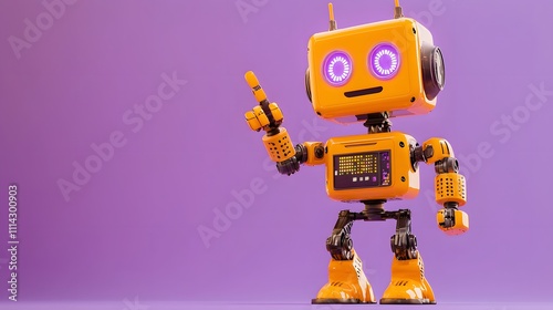 © Muhammad, Naklejka premium Funky Orange Robot with Excited LED Eyes Pointing to Top-Right Corner, Solid Light Purple Background, Perfect for Ads with Copy Space
