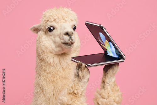 Obraz premium Funny alpaca holding a foldable smartphone and looking at it in surprise