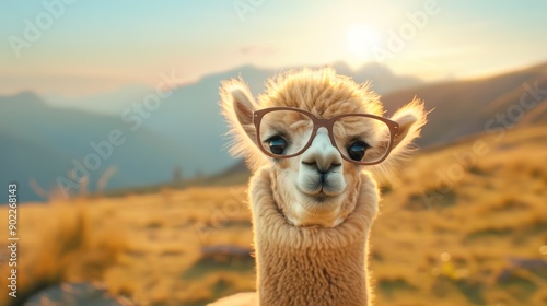 © Ndoomyim, Obraz premium Funny Alpaca with Glasses in Sunset