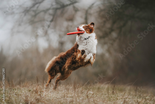 © Lait_ph, Fototapeta premium Funny Australian Shepherds dog run and fly for frisbee in spring