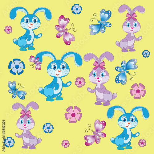 © velishchuknatali, Naklejka premium Funny baby rabbits. Yellow background. Composition, pattern. Isolated children's cartoon characters. Design for textiles, wall hangings, wrapping paper.