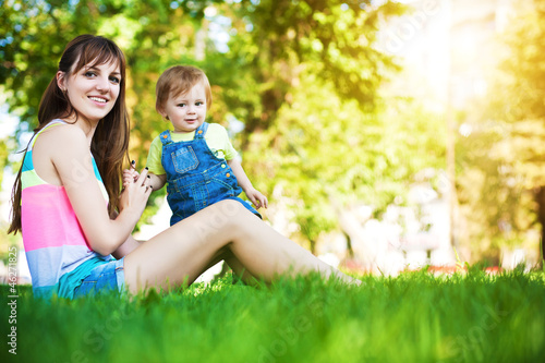 © Dmytro Titov, Fototapeta premium funny baby with mom in a greenl summer park