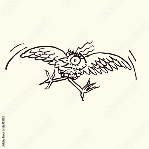 Fototapeta premium Funny bird enjoying flying with surprised eyes, hand drawn doodle, sketch in...