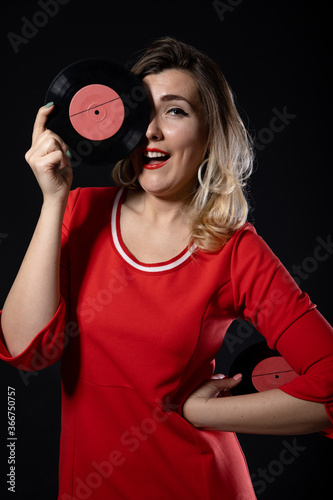 © Sergey, Fototapeta premium funny blonde girl with vinyl records in hands on a black background