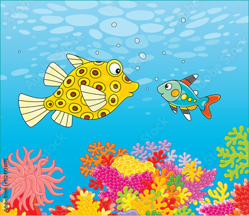 © Alexey Bannykh, Naklejka premium Funny boxfish and an x-ray fish swimming in blue water of a colorful coral reef in a tropical sea, vector cartoon illustration