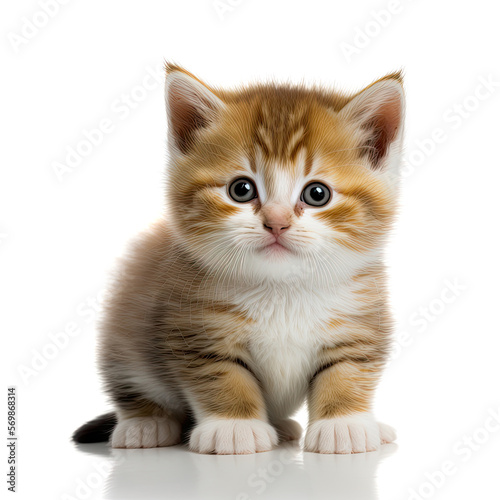 © Gelpi, Obraz premium Funny brown kitten with beautiful big eyes posing on a white background. Lovely fluffy cat. Free space for text. Generative AI