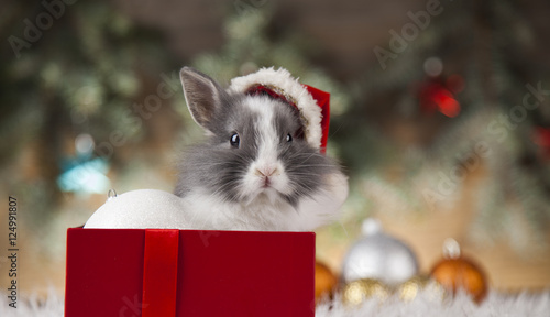 © Sebastian Duda, Naklejka premium Funny bunny and Christmas background with winter decoration