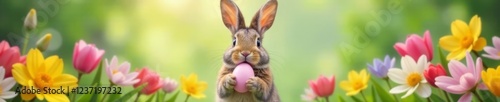 © Pawarit, Obraz premium Funny bunny holding eggs in front of colorful spring flowers , spring flowers, bunnies, easter eggs