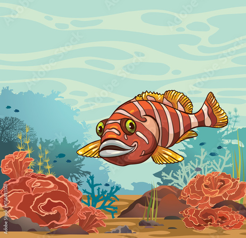 Fototapeta premium Funny cartoon fish and coral reef. Underwater illustration.
