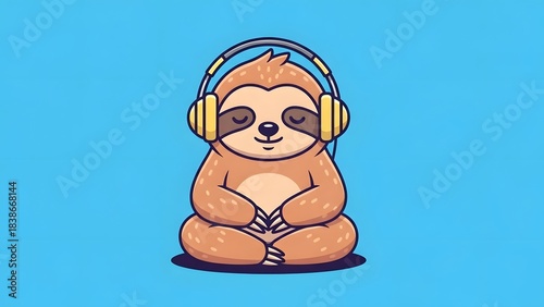 © SitiZoe, Naklejka premium Funny cartoon illustration of a smiling sloth in a white earphone