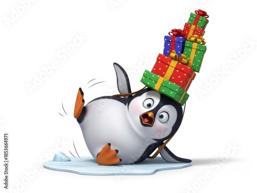 Obraz premium Funny Cartoon Penguin Falling on Ice with Stack of Colorful Holiday Gifts...
