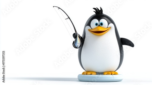 © A4719, Fototapeta premium Funny Cartoon Penguin Holding a Fish with a Fishing Rod