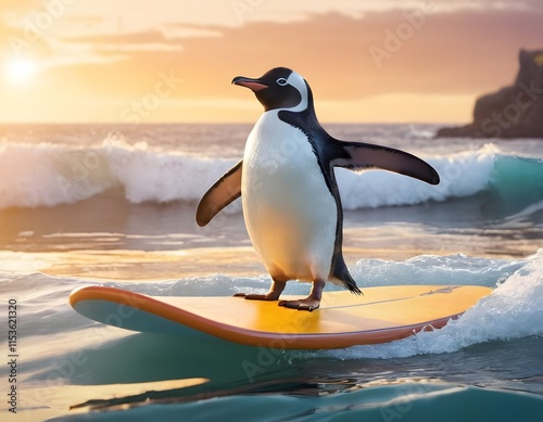 © Mubashir, Fototapeta premium funny cartoon penguin on the beach playing in the sea water blue sky sunlight cool weather