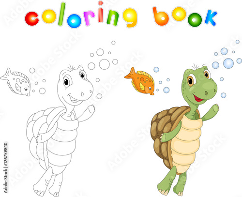 © fir4ik, Obraz premium Funny cartoon turtle and fish in the sea