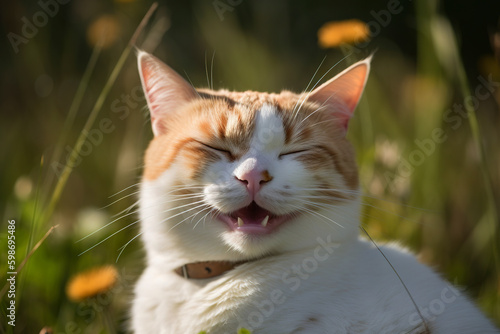 Fototapeta premium Funny cat laughing. Happy and kind relaxed kitten face with happy satisfied smile. Generated AI.